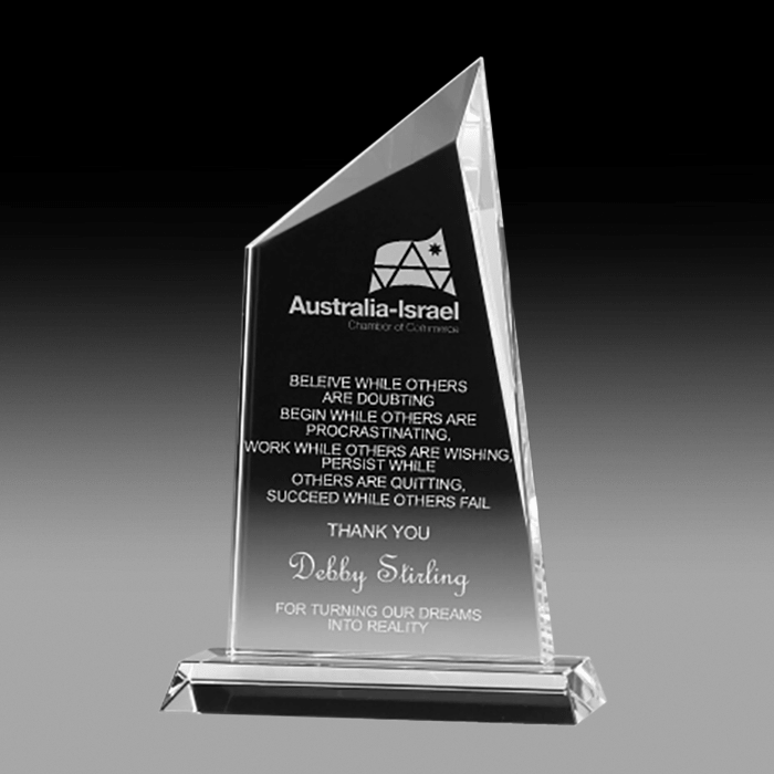 Faceted thick clear crystal peak on tapered crystal base. Quality presentation box included. Your award is laser engraved white or add spot colour to your branding identity with additional vinyl artwork.