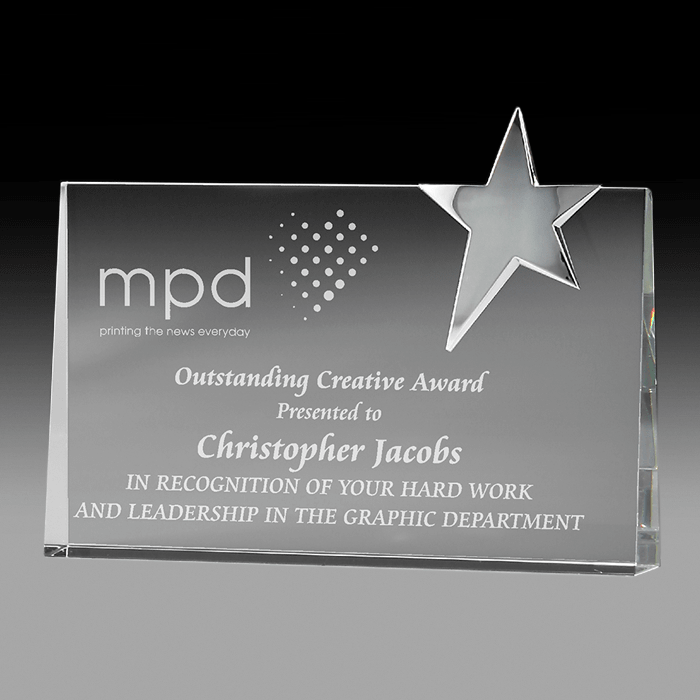 Reward excellence with this landscape orientated presentation of pure clear crystal adorned with a shining chrome star. Presentation box included. Laser engraved frosted white or add spot colour vinyl artwork.