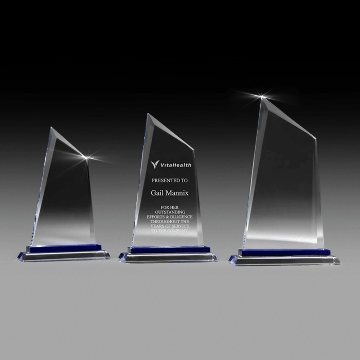 Shine the spotlight on your best performers with these stunning clear and blue glass awards. Laser enrgaved a crisp white finish or add vinyl colour artwork for your logo.