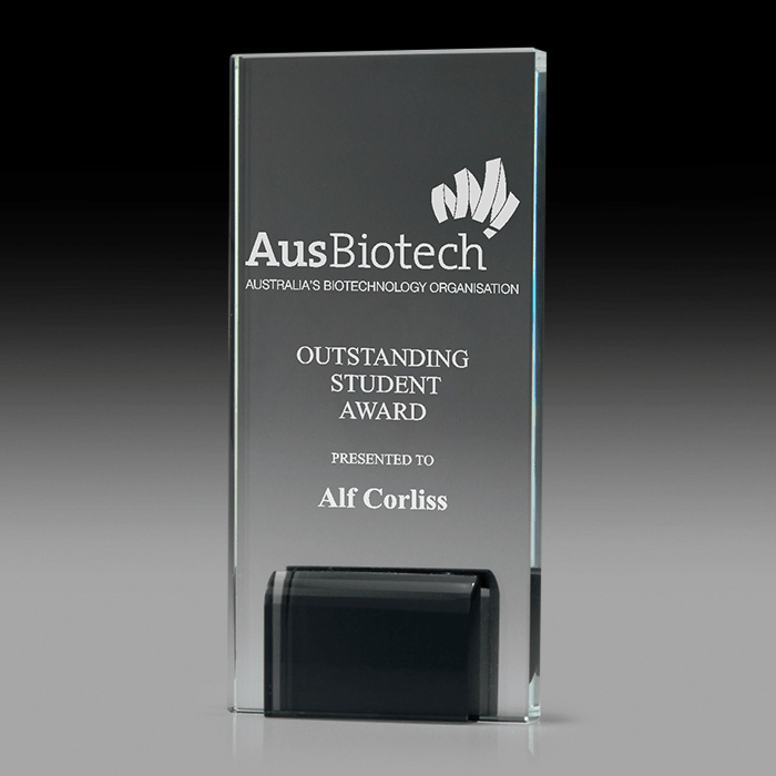 This elegantly micro-bevelled glass tower award provides a great statement to script your words of recogntion. Laser engraved white or add spot vinyl colour as well to your corporate logo.