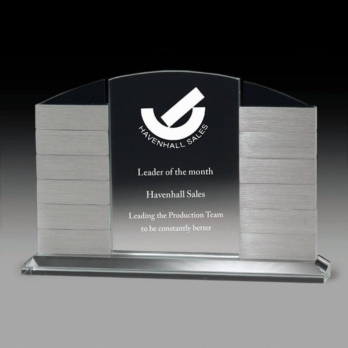 Your perfect perpetual award presented in jade glass with 12 separate engraveable brushed aluminium panels. Award artwork is laser engraved white or add spot colour to your logo with additional vinyl artwork.