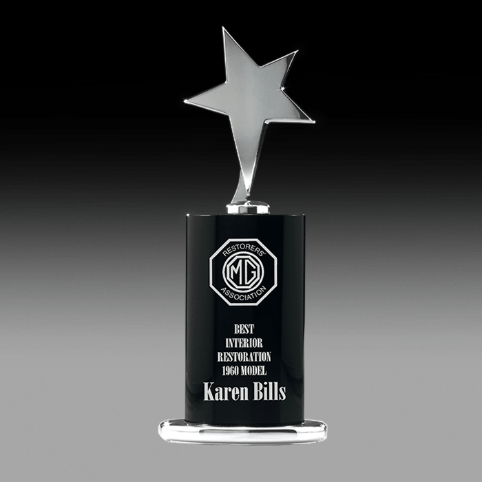 This elegant presentational award combines a striking silver star on a solid oval crystal tower and chrome plinth. Quality presentation box. Laser engraved or full colour UV printed on the crystal base plate.
