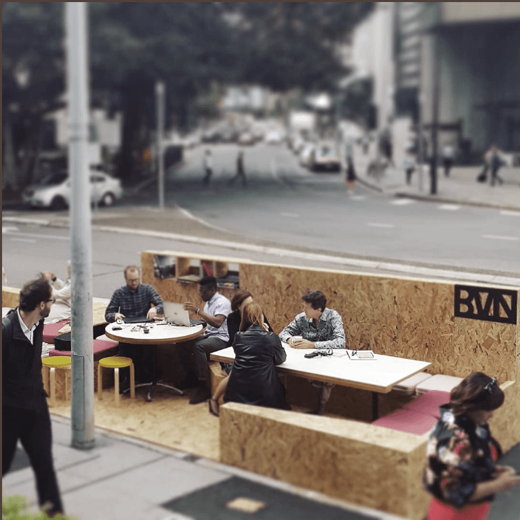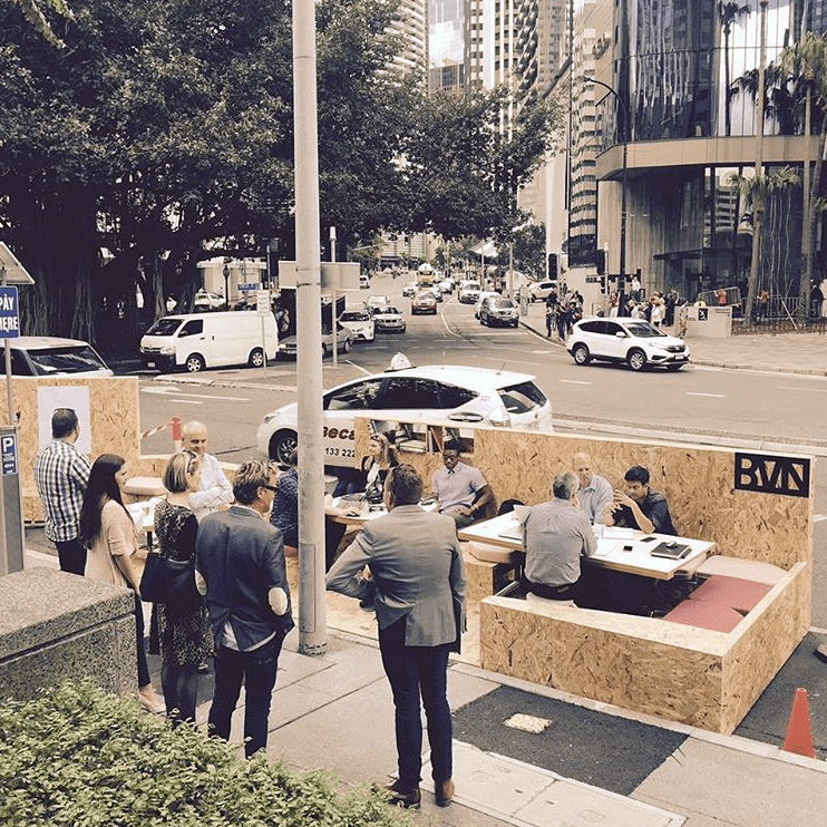 Brisbane Architecture practice BVN made a workplace on the street as their contribution to Brisbane’s PARK(ing) Day on Friday 18 September 2015. A‘setting’ to extend public awareness of the capacity for public spaces to support both civic and business activity.