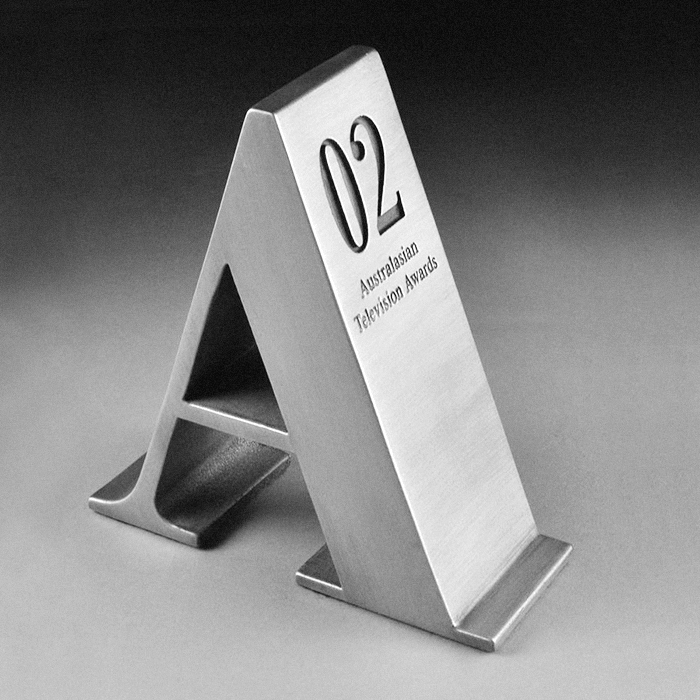 Starting with a master mould of an extruded ‘A’ and cast in resin, these awards were engraved and coated to a monolithic finish.