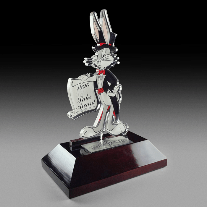 Celebrating one of our first custom awards back in the 1990’s and perennial as Bugs Bunny himself, this award recognised travel agent sales acheivements for Warner Bros Movie World, still going strong today. Made from laser cut acrylic with colour printing on a rosewood timber base.