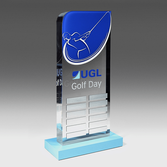 UGL Golf Day Award as Acrylic Tower on Blue Timber Base