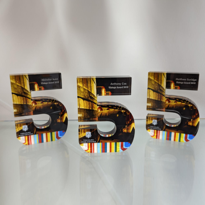 Rather than the normal service awards, Treasury Wines were looking for a different manner in which to recognise and celebrate employee years of service. These 5 year service awards are a wonderful and fresh recognition piece designed and manufactured in Australia. Made from laser cut and flame polished 25mm acrylic – UV printed in reverse and laser engraving to front face.