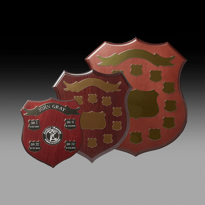 Classic Rosewood timber shield with a laser engraved gold metallic panel.